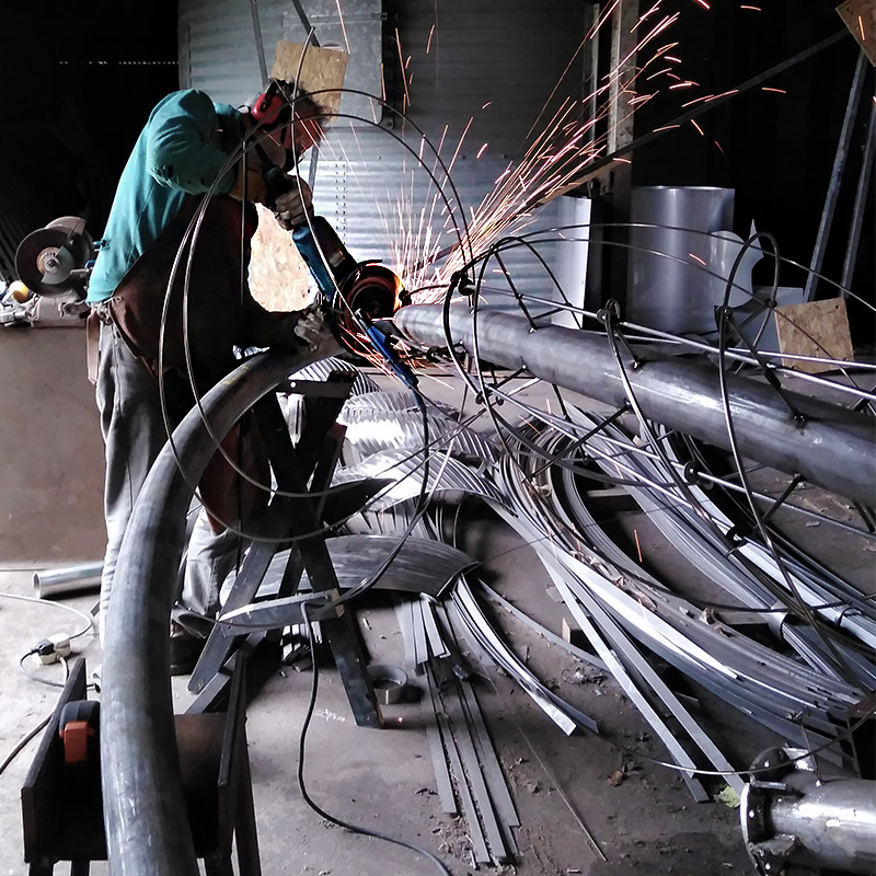 Fabrication began with the structural core, formed of curved tubes which approximate the form of the sculpture. Short eye-dowels were welded at intervals along the sculpture according to the geometry of the coiling "rope" surface. Rods were then threaded through the eye-dowels around and along the sculpture to form guidelines and edges for the double-helical metalwork cladding.