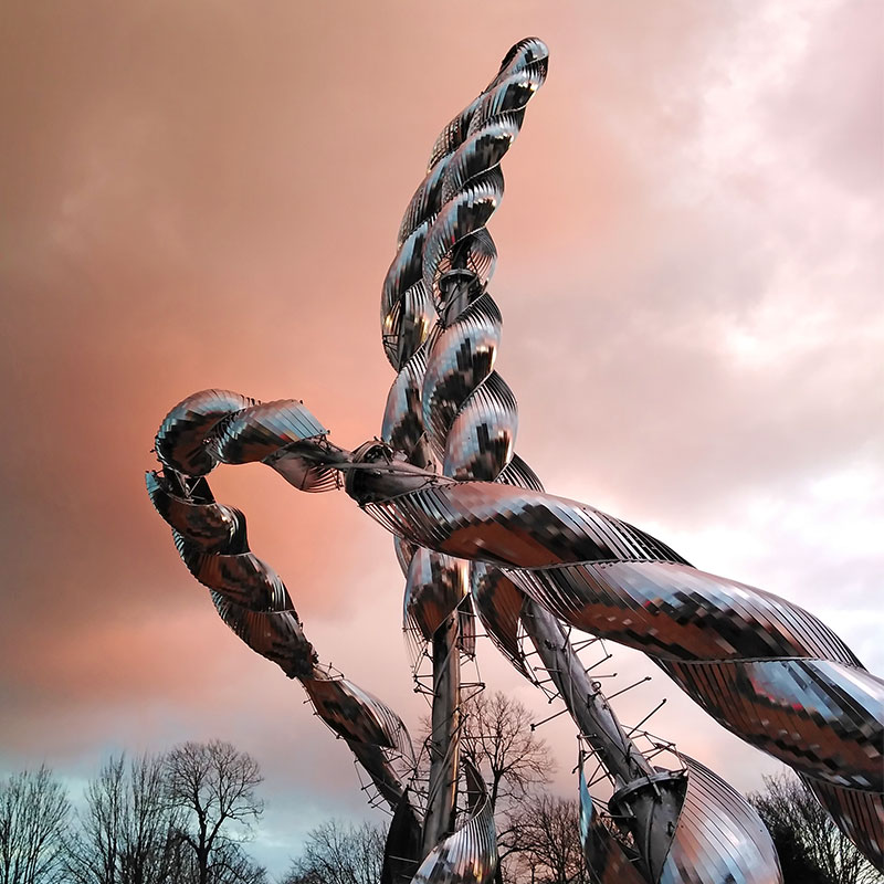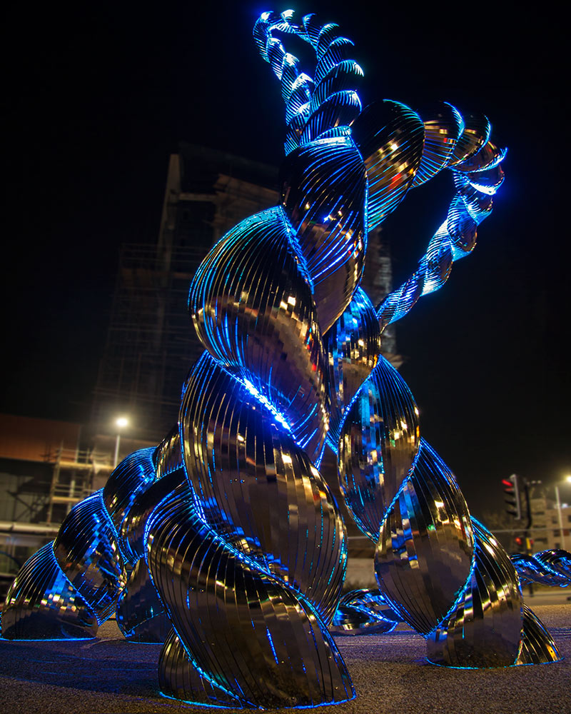 The gaps widen as the sculpture coils upwards allowing more light to escape, making the colour more vivid and creating a prominent landmark from a distance. Up close, blue light reflecting off the polished surfaces creates a spectacular effect.
