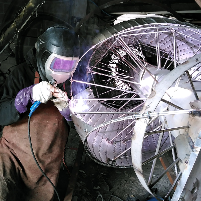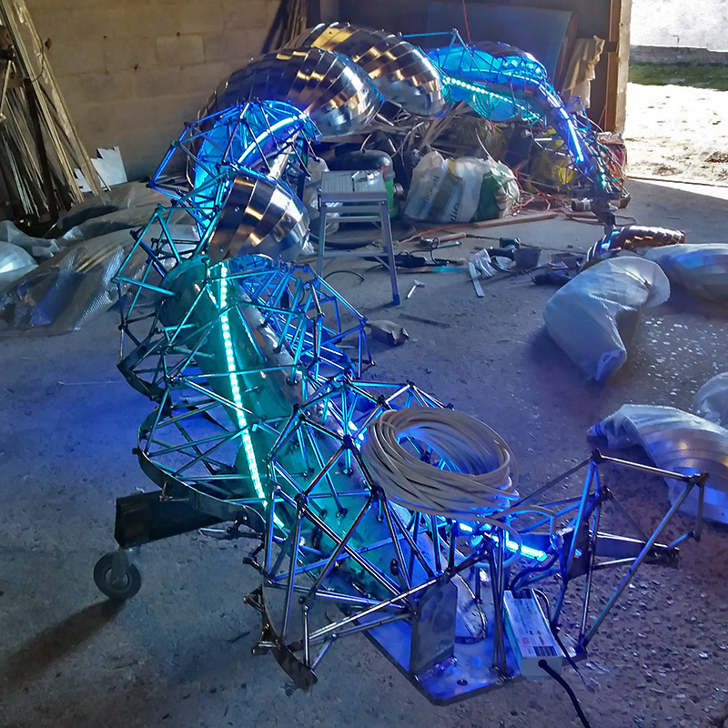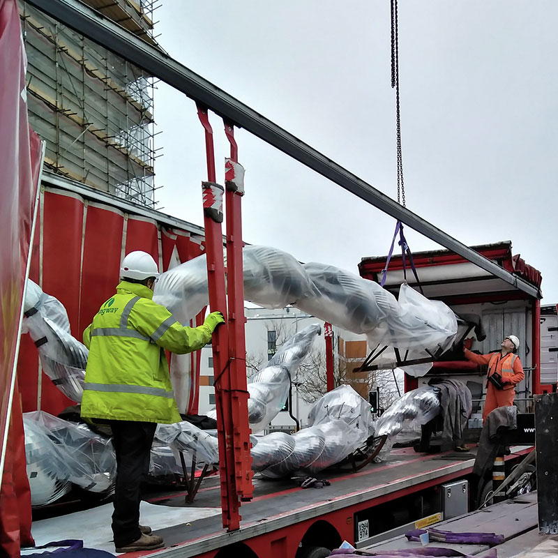 The scale of the sculpture meant it was worked on horizontally, with only about a quarter of the artwork ever assembled at one time. As each section was completed, the cladding pieces were detached, buffed, then sent off for electropolishing. Temporary struts were fabricated to allow the sculpture sections to be wheeled about, lifted and transported without damaging the surface. Finally, the LED lighting was added to the stuctural core and the polished cladding sections reattached ready for installation.