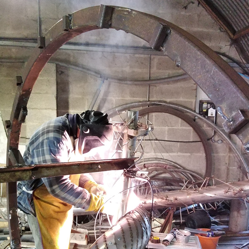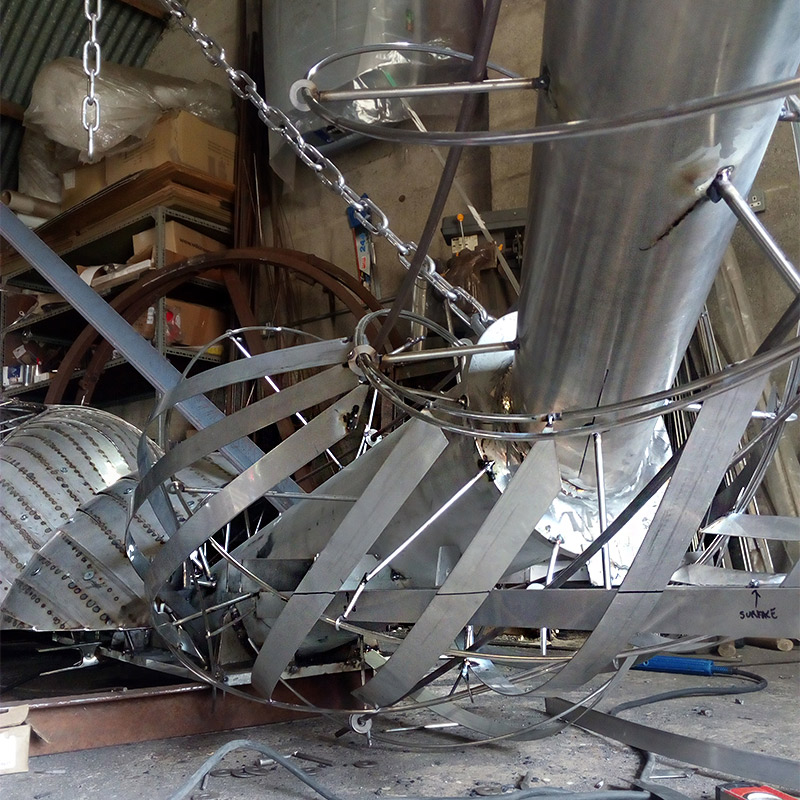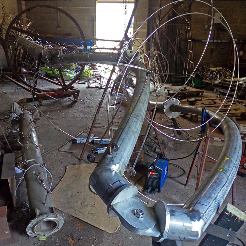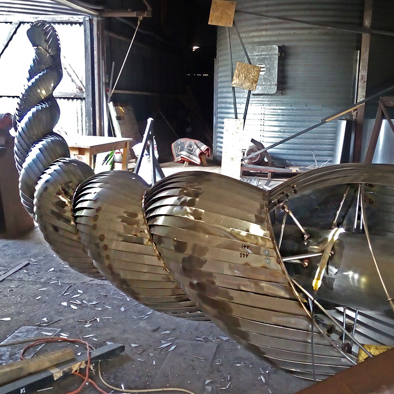 Fabrication began with the structural core, formed of curved tubes which approximate the form of the sculpture. Short eye-dowels were welded at intervals along the sculpture according to the geometry of the coiling "rope" surface. Rods were then threaded through the eye-dowels around and along the sculpture to form guidelines and edges for the double-helical metalwork cladding.